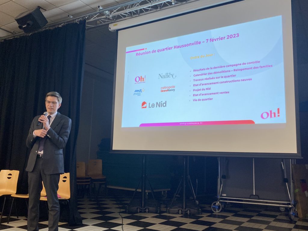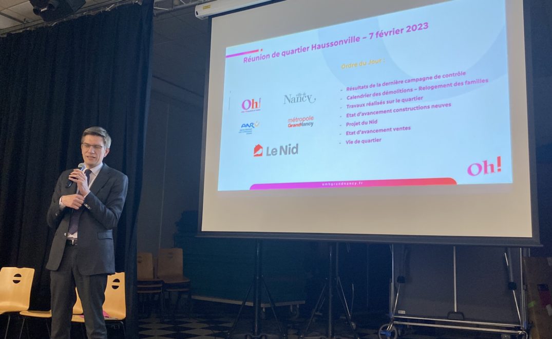 Le 7 février 2023 se tenait une nouvelle réunion publique dédiée au devenir du quartier Haussonville à Nancy. Ce temps d’échanges était organisé par l’OMh du Grand Nancy, son Président Mathieu Klein et son directeur général Jérôme Dal Borgo afin de faire le point sur les différentes opérations relatives au renouvellement urbain de ce quartier emblématique et à la forte personnalité.