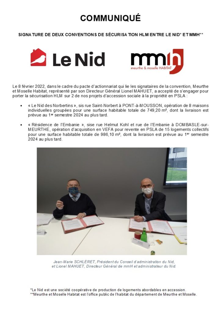 Le 8 février 2022, dans le cadre du pacte d’actionnariat qui lie les signataires de la convention, Meurthe et Moselle Habitat, représenté par son Directeur Général Lionel MAHUET, a accepté de s’engager pour porter la sécurisation HLM sur 2 de nos projets d’accession sociale à la propriété en PSLA :